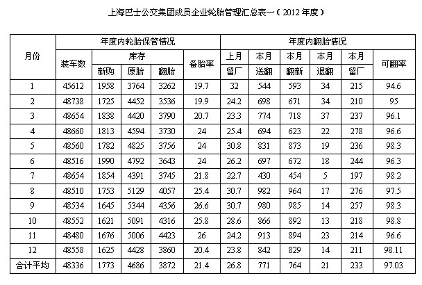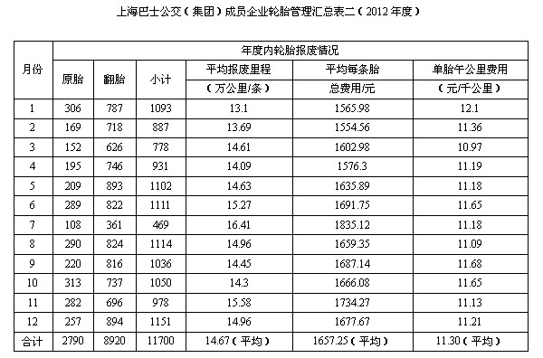 按照2012年新胎購置成本,40.2萬元可購243條輪胎。報表以充分說明上海公交對節(jié)約輪胎資源,所采取的措施、方法是相當有成效的,有效履行企業(yè)對節(jié)約資源、_創(chuàng)建低碳社會的責任。